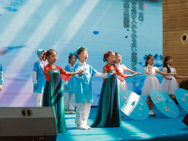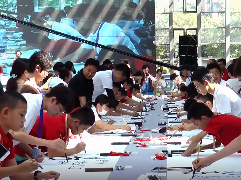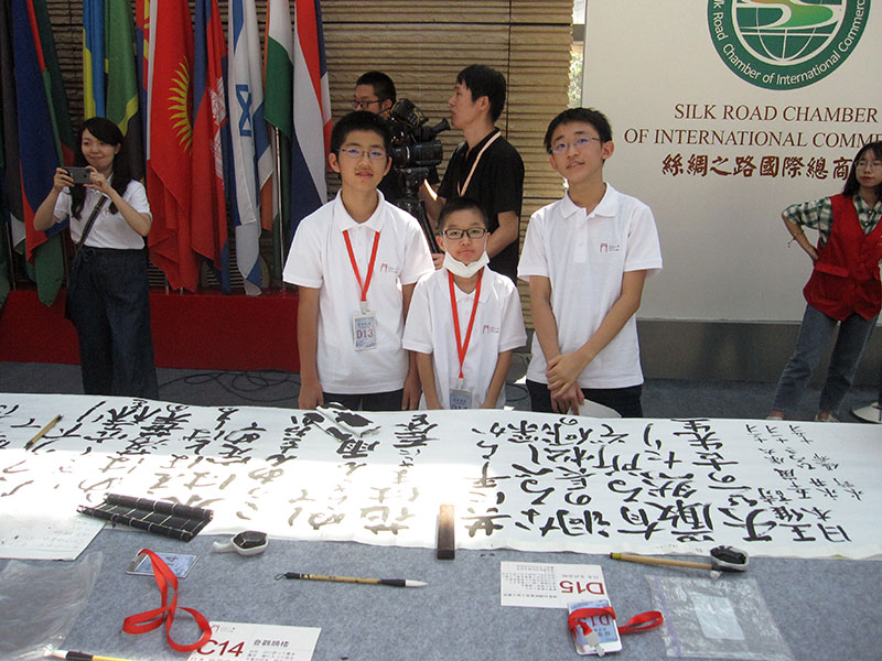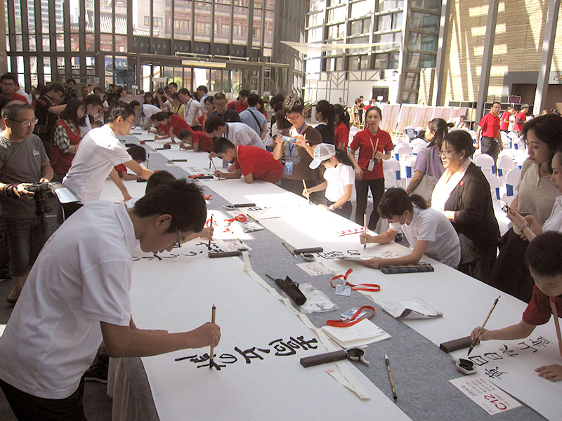 明るく開放的な吹き抜けの素晴らしい会場で盛大で華やかなセレモニーが行われ、日中韓の学生、書家が東アジアの友好を願い、唐の時代に思いを馳せ、唐詩を書き上げました。