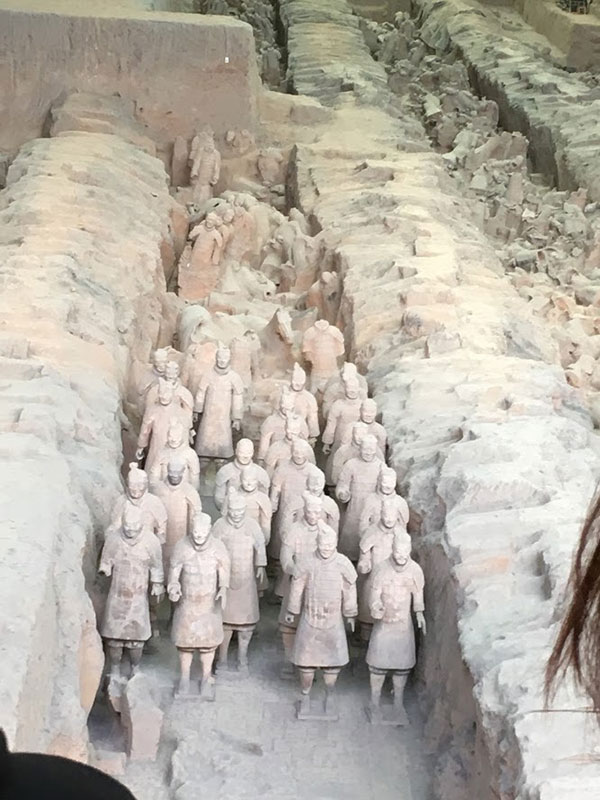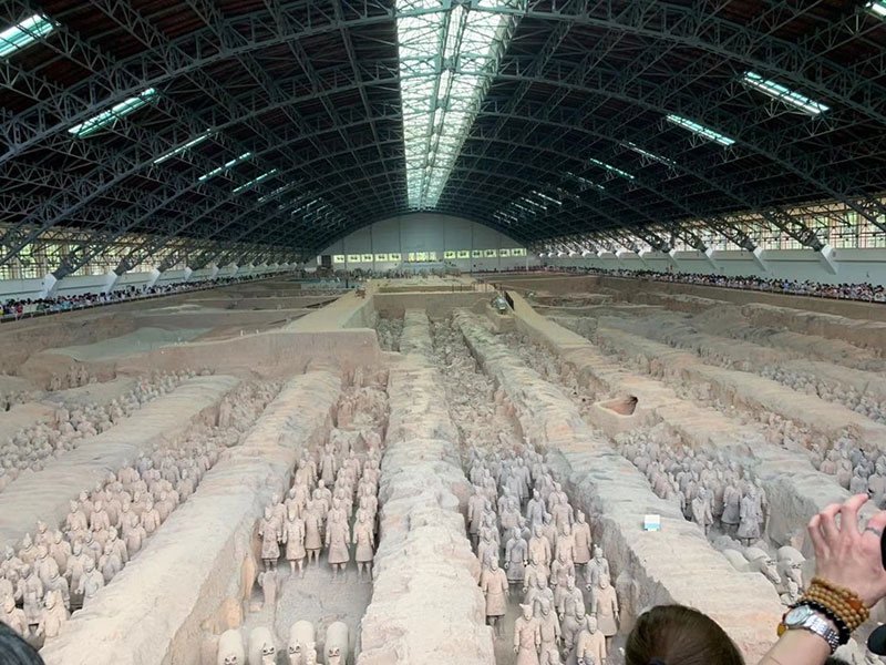 中国では観光地に等級があることが驚きで、最上級の5Aである始皇帝陵兵馬俑博物館、大唐芙蓉園、大唐不夜城等の見学も行かせてもらいました。兵馬俑は、西安からバスで片道一時間程かかる遠い場所だった為か、実際に兵馬俑見学ができたのは30分程。ですが、一番人気で最大の大きさの一号坑を何とか見学できました。一号坑は、巨大な体育館のような建物で、今までに経験したことがない人混みで、手を頭上に必死に伸ばし、スマホで兵馬俑の写真数枚と動画撮影をするので精一杯。巨大な建物内は非常に蒸し暑く、屋外に出た時は、気温30度以上はあるはずなのに、まるでクーラーが効いている部屋であるかのように涼しく感じられました。