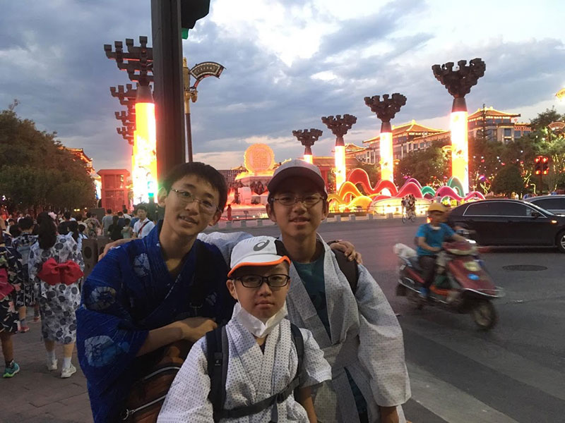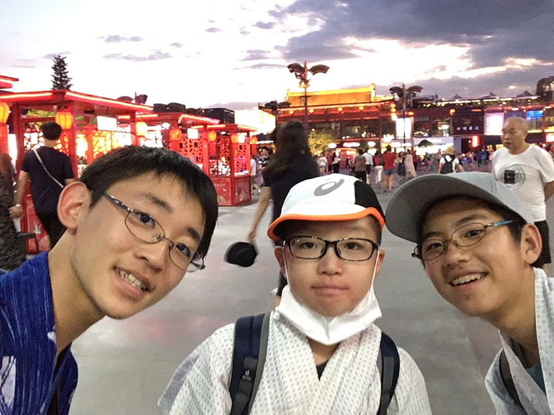 西安は街全体が巨大なテーマパークのようでした。至る所に、歴史上の有名な人物の像、歴史的建造物があり、13の王朝があった古都の偉大さを感じました。大唐不夜城は近代的でイルミネーションが綺麗で持参した浴衣を着てお祭り気分で楽しみました。西安の大通りは華やかで近代的な建物が並び、路地裏は昔ながらの風情ある建物。対比が興味深かったです。僕達がお土産を買った店では現金が使えましたが、街中や空港の自販機はキャッシュレス化が進み、現金は使えませんでした。持参した海外用モバイルWI-FIのおかげでスマホが自由に使えたので、街中で見かけた中国のわからない漢字等を色々検索していました。日本との違いがとても面白かったです。